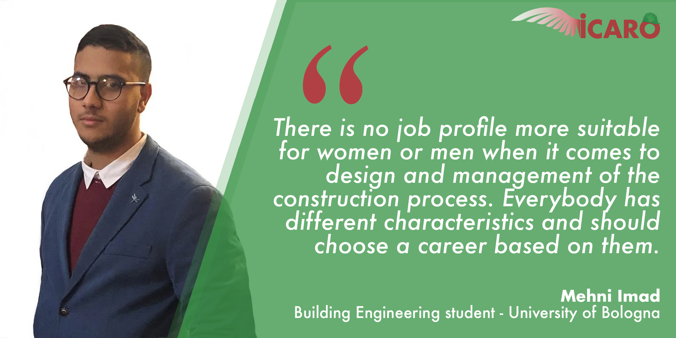 Mehni Imad is 20-year-old men, originally from Morocco and born in Italy, who always had the interest and clear ideas about his future in the construction field. He studied for five years in hight school in a construction course and he had the opportunities to work in architecture and engineering offices for an internship. In 2018 he had the opportunities to work in architecture firm in Jerez De La Frontera, Spain for a high school Erasmus+, in which he understood better about the working process in the construction field. After that he started a university career in building engineering in the University of Bologna.